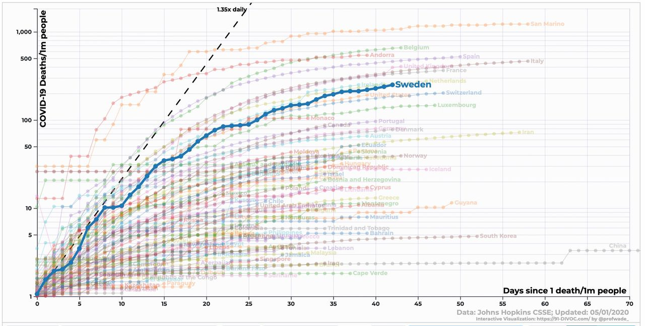 The only major Western country in the "hot zone" of the Covid-19 pandemic not to have imposed large-scale shutdowns of public facilities and the economy has been Sweden. They have closed higher education (although not grade schools, which have remained open), banned bar seating and congregating around bars, banned large gatherings, and encouraged voluntary distancing. This policy has been spearheaded by Sweden's state epidemiologist Anders Tegnell, who has argued that shutting down society, with all of its inevitable negative economic and health consequences that are difficult to predict and quantify, makes much less sense than focusing restrictive measures on isolating the most at risk within the population. While distancing themselves from the idea that their policy is based on achieving so-called "herd immunity", in unguarded moments Sweden's health officials admit that that's not inconsistent with their purpose.