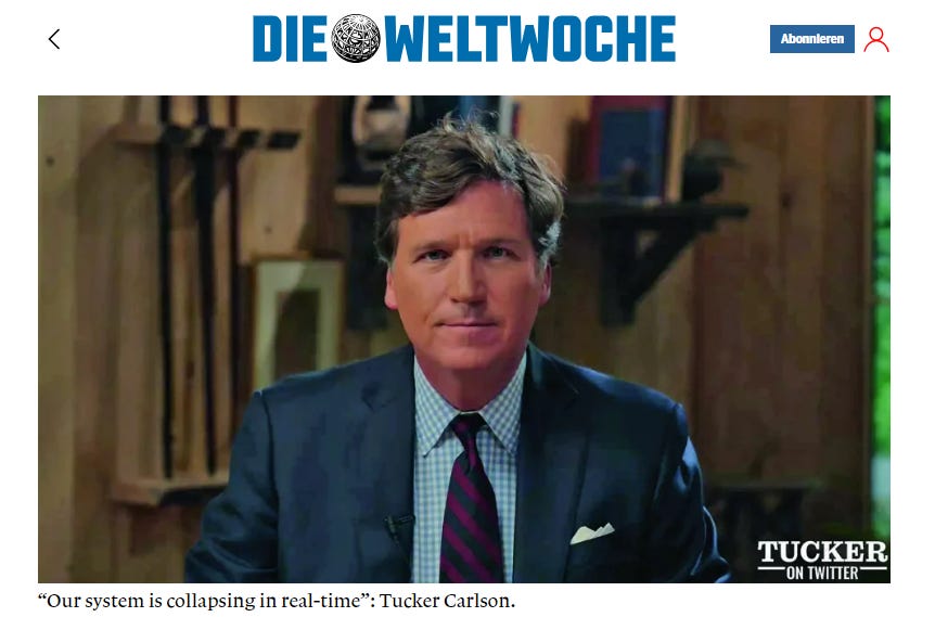 Tucker Carlson seems to be admired and hated pretty much equally by millions of Americans. Whatever your thoughts about him, one thing is for sure: at 54, he no longer cares what anyone thinks, if he ever did. Freed from the constraints of a daily network format on Fox, he’s doing it his way now, warts and all, and, by most objective measures, is having tremendous success challenging orthodoxies and the powerful. Swiss weekly magazine Die Weltwhoche talks to him about the fear that grips mainstream journalism, and it’s well worth a read: