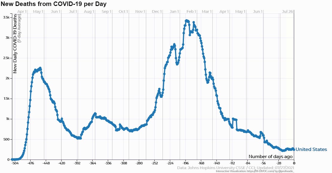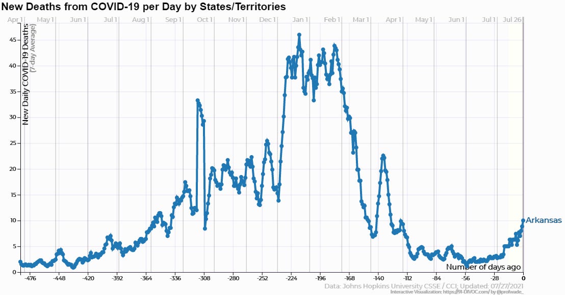 One example of that was a recent spate of headlines across local media announcing that two Arkansas children had died of Covid, with headlines that implied these were new deaths being caused by the Delta variant. When you read the story you learned that, while one of the two child deaths in Arkansas attributed to Covid had indeed occurred recently, the other was last year, apparently only recently having been confirmed. Of course, any death, and especially one involving a child, is a tragedy for the family and friends affected. But it remains true that of the 600,000 plus Americans whose deaths have been pinned on Covid since the beginning of the outbreak, fewer than 400 were under 18. Children have a statistically higher risk of death from crossing the street. Whether the Delta variant will change that remains to be seen, but there’s no evidence yet that it has.