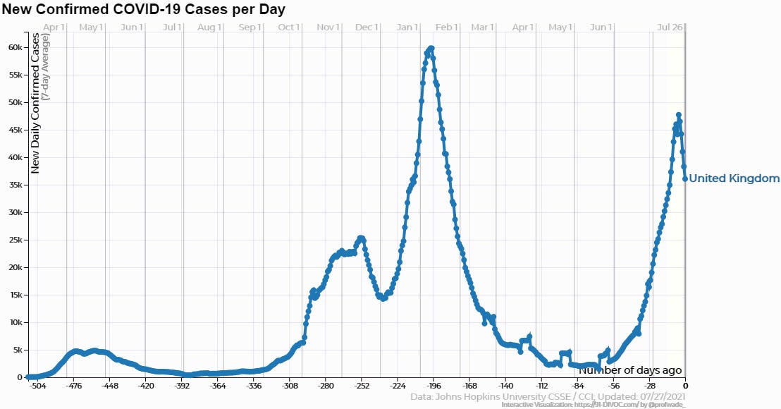 If you’re a Covid vaccine advocate, the UK is about the best place you can point to make your case. It has a large, dense population, that appears to be more trusting of government than are Americans, and thus more willing to comply with its demands (opinion polling has recently indicated a large percentage of the British public support restrictive Covid measures, even if implemented permanently). Until recently, vaccine advocates would have been disappointed in the number of British cases, which were climbing steeply. But within the last week or two, there’s been a sharp reversal in them.