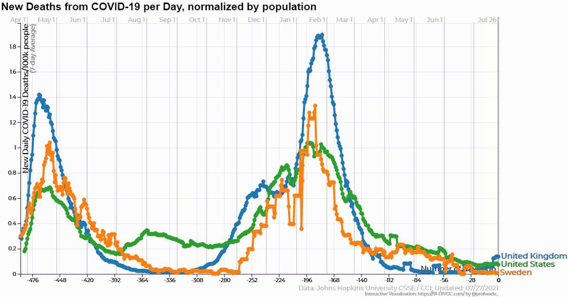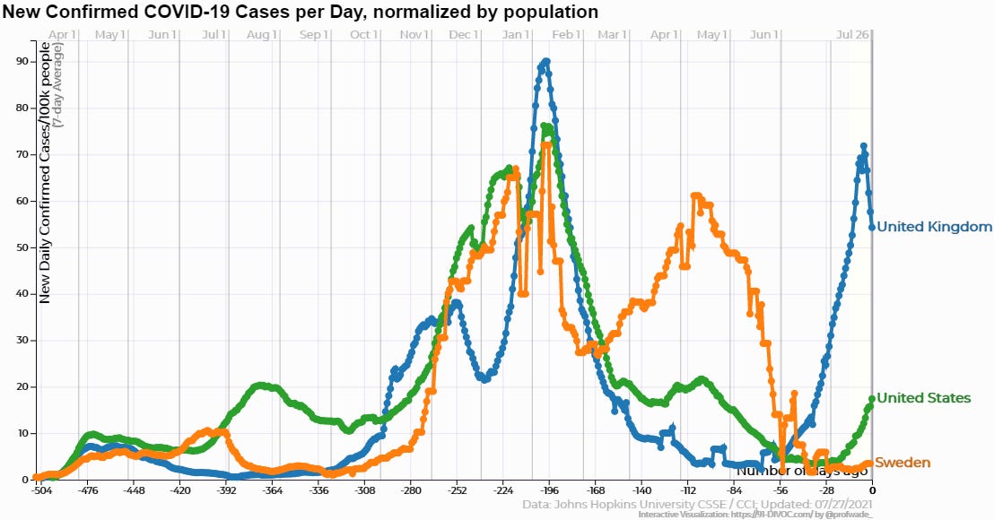 Excuses were never in short supply. The main one seemed to be that Sweden’s population and population density were low and that meant it couldn’t be compared. The country has ten million people, with only 60 people per square mile. But that latter stat is highly skewed by the fact that vast tracts of Sweden’s mountainous north and west are virtually unpopulated. In the places where Swedes actually live, the density is much higher. 85% of Swedes live in urban areas. And if you think they haven’t yet faced the Delta variant, you’d be wrong.