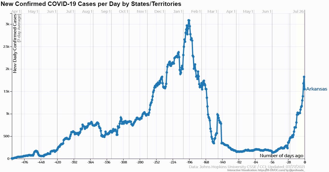 One of the hottest of hot spots is my state of Arkansas, where reported cases are up significantly since June and deaths attributed have been climbing as well. This is widely blamed on the low vaccination rate. As of this writing, according to the Arkansas Department of Health, about 41% of the state’s vaccine-eligible population has been fully immunized, with an additional approximately 11% having had one shot. There’s been a noticeable uptick in vaccinations here recently as government and media have sharply increased alarmist rhetoric.