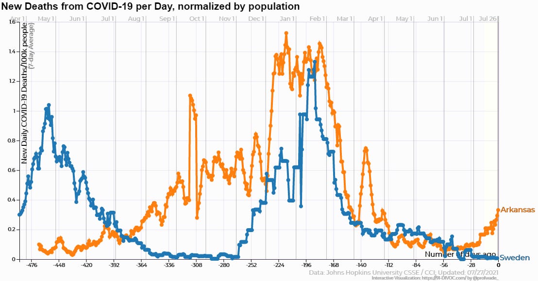 But if the US and Britain are too big to compare to Sweden, let’s compare their outcomes to Arkansas, with a population of three million people and a density more comparable to Sweden. Arkansas was never a bastion of Covid measure compliance, but we did send schoolchildren home, close bars, restaurants, and other venues, and mandate masks in public accommodations, none of which Sweden did. So, how do they compare? After suffering through their initial wave before things had really taken off in Arkansas, quite a bit better. Then around the beginning of this year their death numbers started to mirror us more closely until very recently when Arkansas began taking off again.