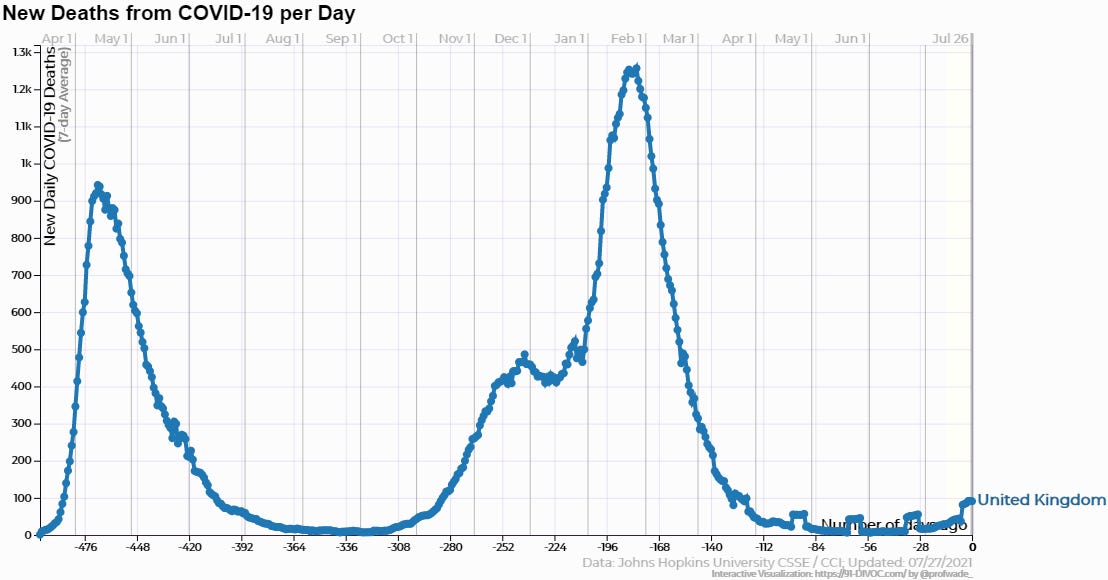 Deaths attributed to Covid in the UK have remained relatively low throughout the second wave. Britain has been one of the strictest states in applying the whole panoply of Covid measures, whether it be mask mandates, lockdowns, or aggressive vaccine distribution and advocacy. Only very recently have the restrictions been loosened (July 19 was widely being referred to as “Freedom Day” there due to the expiration of a number of measures). But since cases were climbing sharply during most of that time while deaths remained muted, it would seem vaccinations would be the most likely measure to credit. If they didn’t do much to prevent spread, maybe they at least reduced disease severity?